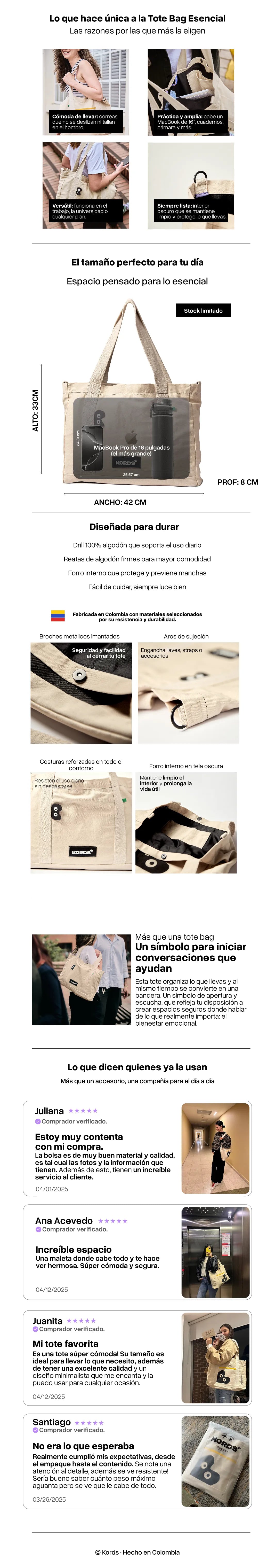 La Tote Bag Esencial tiene el espacio ideal para tu laptop, cámara y cuadernos en un solo lugar. Su diseño versátil combina con cualquier look y se adapta a cada ocasión.